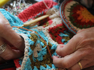 On Friday morning some of the group were still finishing off squares and the rest were pinning and blocking and learning new methods for joining in crochet or by sewing..